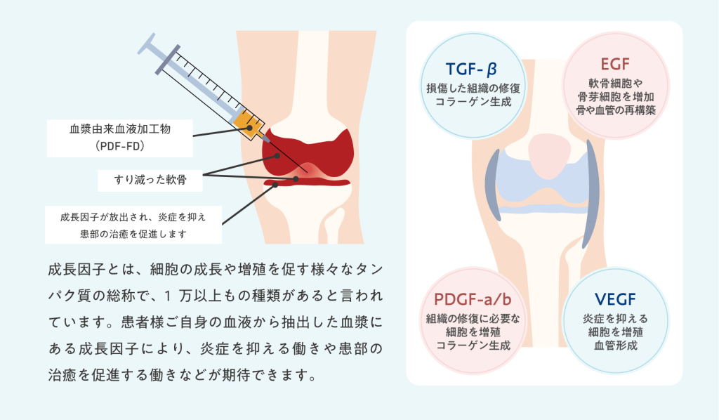 PDF-FD(Plasma Derived Factors Freeze-dry)療法は、血液内でも、より多くの成長因子を含む血漿に着目して開発された血液の自己修復機能を使った新しい局所注射の治療法です。血漿から不純物を取り除き、更に独自加工を施し圧縮したことで、少量しか注入できない局所患部に対しても高濃度かつ持続的に作用するように開発されました。類似する血小板細胞などの治療法との相違点は、血液内で成長因子などの栄養成分が豊富に含まれている血漿分画から成長因子などを抽出している点です。自己血液を使用するため、安全性が高く、アレルギー反応や拒絶反応のリスクが極めて低い治療法です。