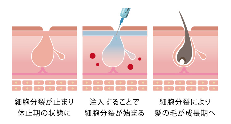 加齢やホルモン変化により進行する壮年期脱毛症(AGA)にも、PDF-FD療法は有効性が期待されています。頭皮に直接PDF-FDを注入することで、毛包細胞の活性化、毛母細胞の増殖促進、血流改善を図ります。